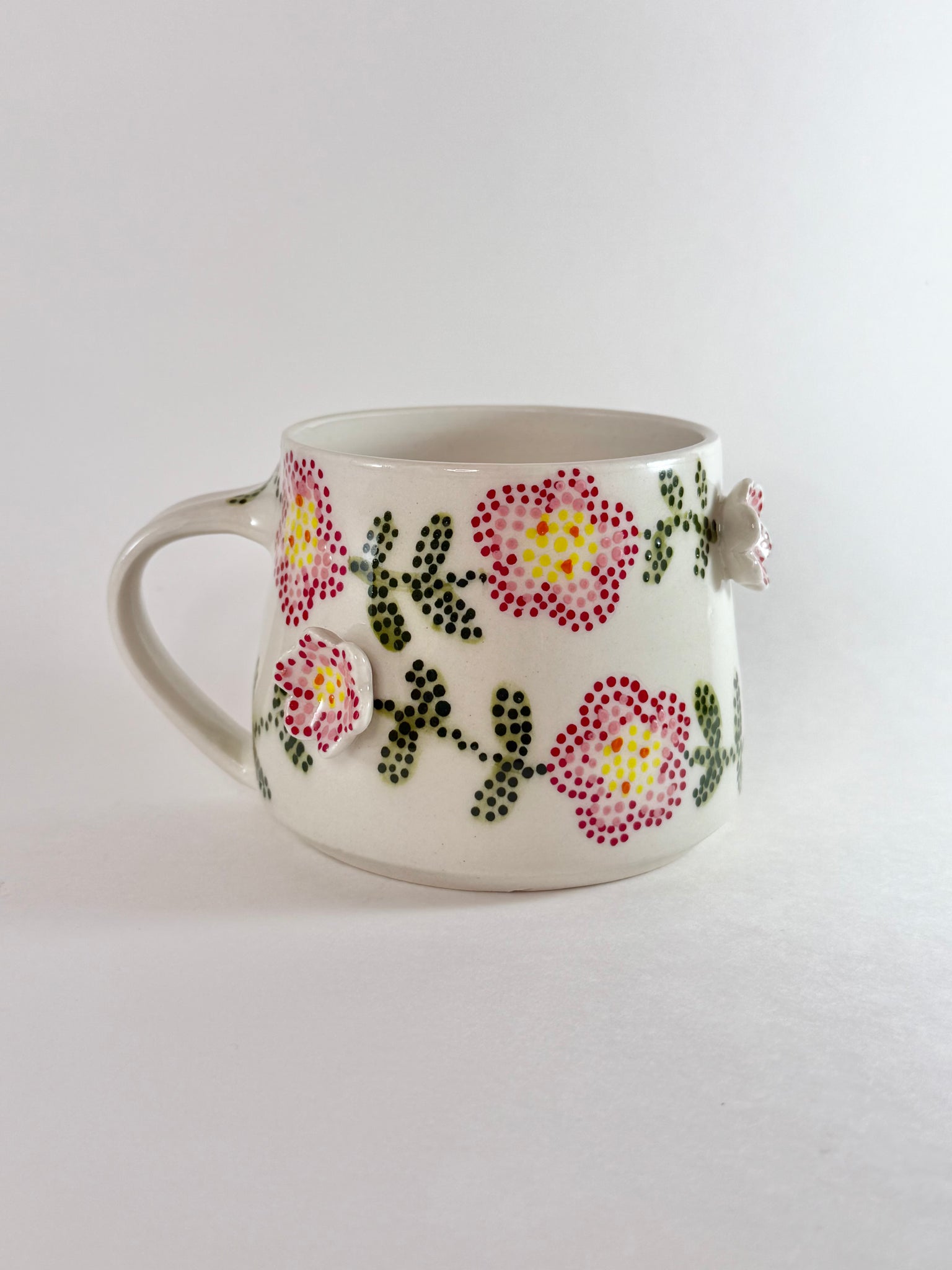 This handmade mug was thrown on the pottery wheel. Once dry it was trimmed and three blossoms were added to its body. It was then handpainted with an Anishinaabe beadwork design of pink blossoms and green leaves and stems.