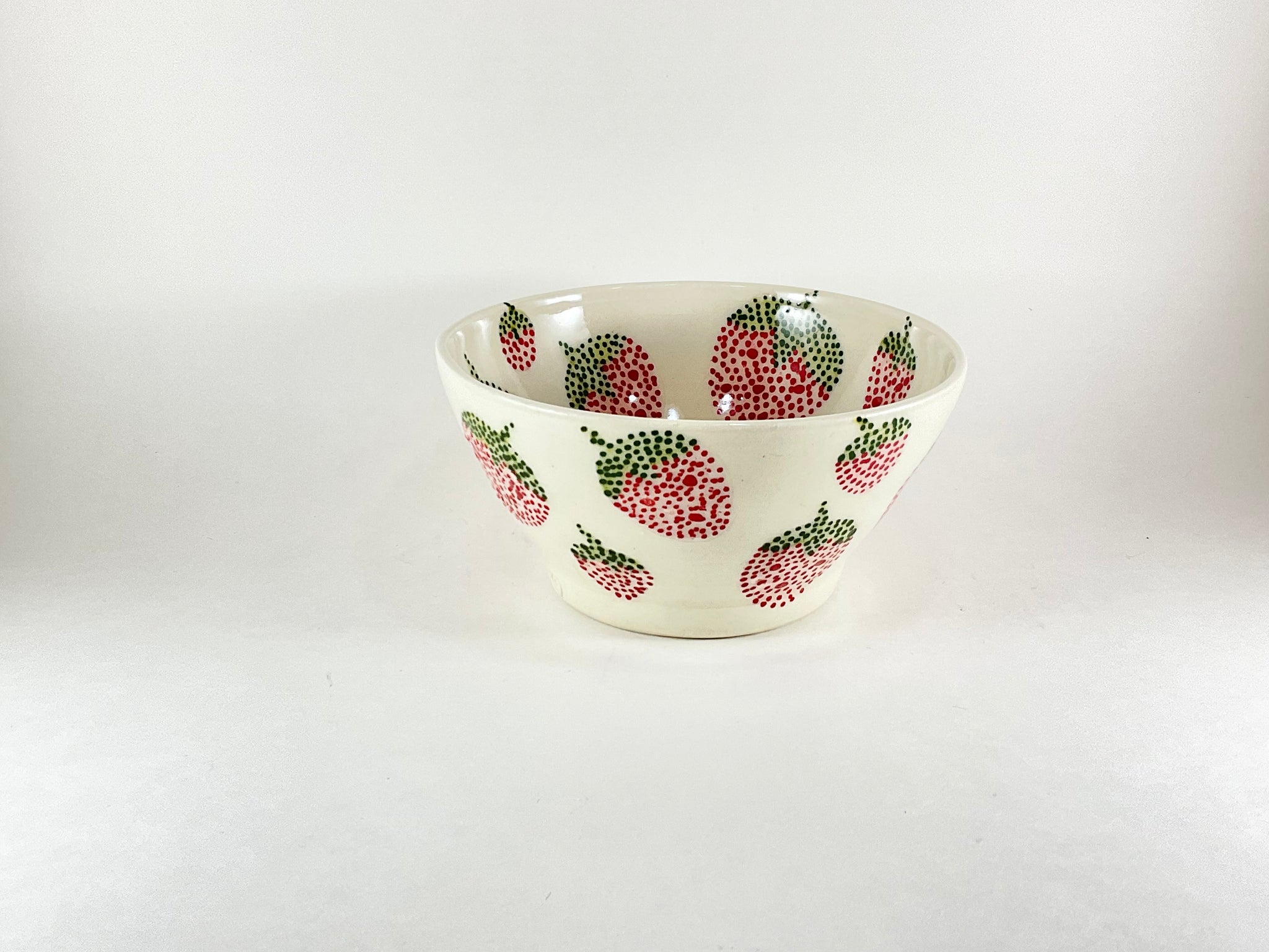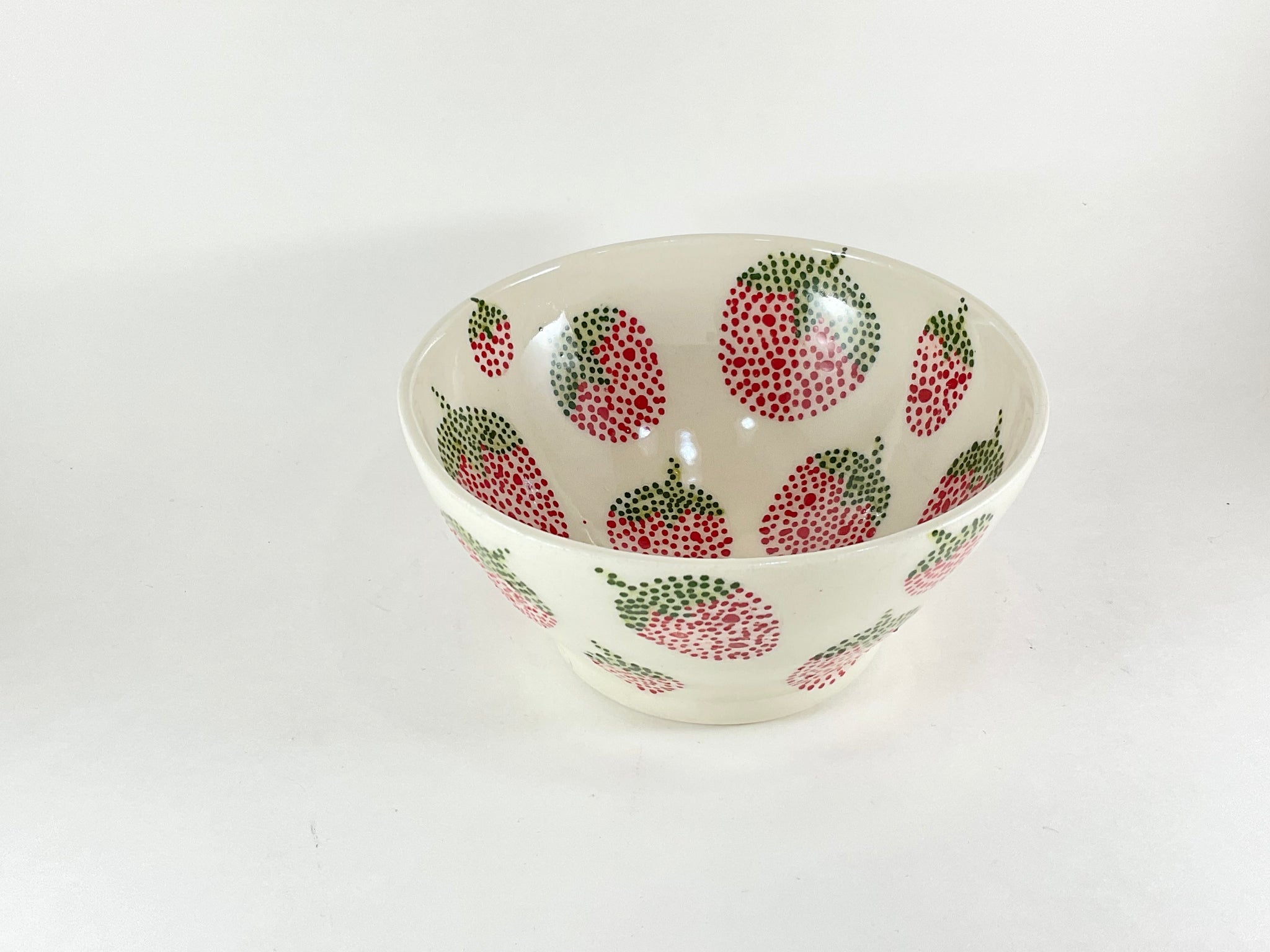 This handcrafted bowl was made on the pottery wheel and decorated with dot patterns inspired by my Anishinaabe beadwork. Made from white porcelain, it is finished with a clear glossy glaze to accentuate the handpainted design.